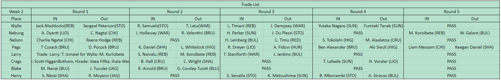 We round the matchups out with Fully Nabuli Blake taking on Something to do with Inagaki in what was the most competitive head to head game of the round. Similarly to years gone by, Blake took the win and pags found a way to lose (with a couple of BPs mind you) 508 (2) to 487 (4th). Blake had SP Marais (75), the Rookie Gatland (53), Naisarani (51) and surprisingly Marx (50) to thank for the tight win. While Pags would have wanted more from SBW (16) and Retallick (15) to go along with big scores from Izzy (70), Todd (61) and Coetzee (60).
