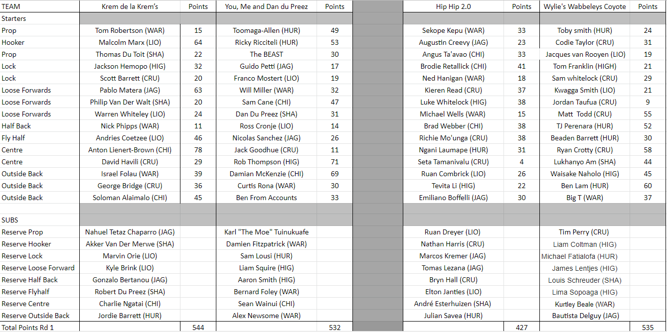 Hip Hip 2.0 fired on almost all cylinders this week and a lot of the boys really stood up in Pags’ time of need. Riccitelli (64pts). Mo’unga (82pts), Savea (65pts), Goodhue (55pts), Evans (42pts) and Todd (41pts) put in big shifts and together outscored Wylies Wobbly Coyotes.