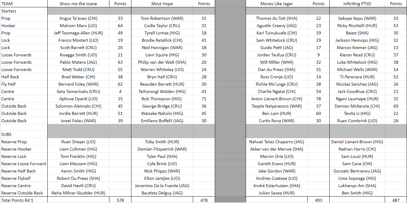 The standouts for Moves Like Jager were; Mo’unga (82pts), Ricciteli (64pts) and Goodhue (55pts), the worst were: Captain Mud Simmons (10pts) and Miller (14pts). In fact, it looked like the tahs were going to do their best not only to break Harry’s heart, by not making the SR Grand Final, but also his spirit, by not making the Fantasy Final.