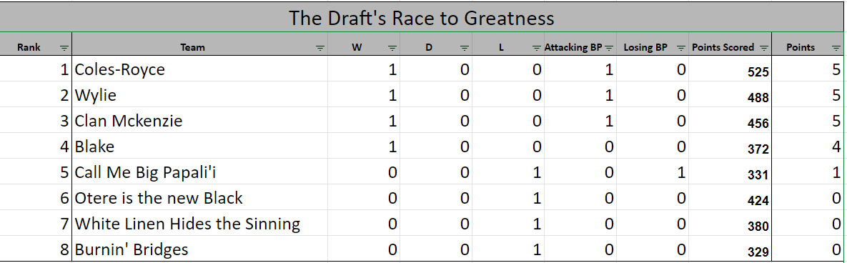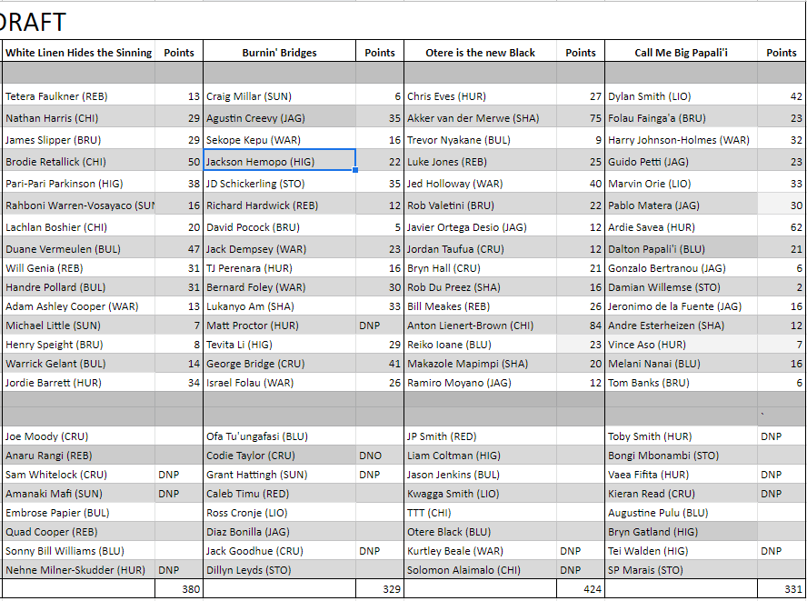 We’ve all converted to Draft Rugby and are really enjoying the set-up, the new take on things and are eagerly awaiting to see all player stats so we can determine our first round of winners and do our own serving of banter for those in spoon-contention.