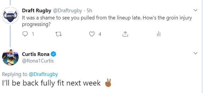 Rob Thompson (Highlanders) – Left ankle injury in rd 2. Fit again and on the bench this week. Source.