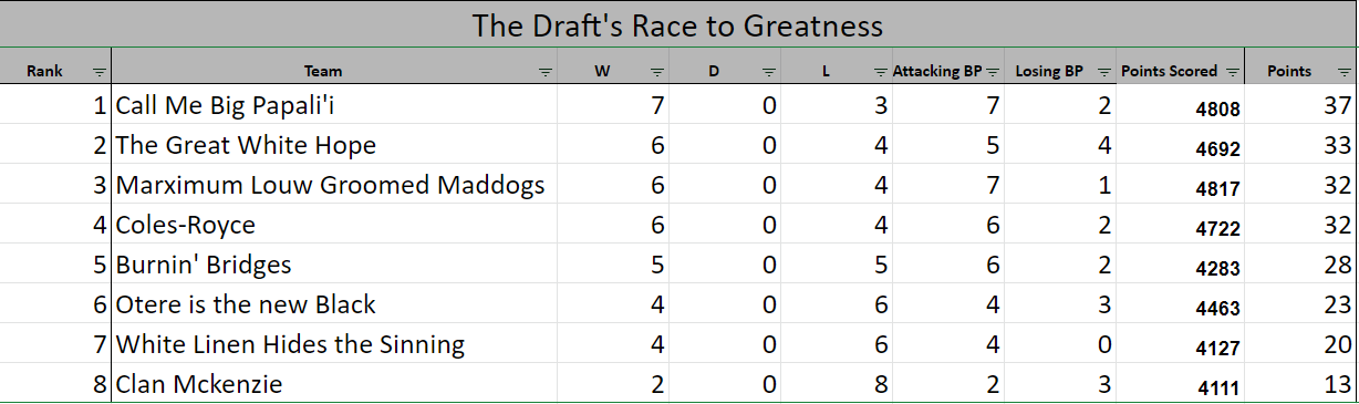 Another winner without an attacking bonus point as the fantasy week struggled on the back of six defensively dominated games. Cargie got the job done with Sean Wainui (55 points), Ma’a Nonu (49) and Allan Alaalatoa (40) scoring solidly, no one else cracked the magic 40 mark, but he was another manager to make sure he fielded a full team, and it got him over the line. You can call Loser Harry consistent, the last placed drafter put up the lowest score of the week despite fielding a full side. It looks like the loss of Damian McKenzie has hit him haaard! Newly drafted one weeker Alex Nankivell (45 points) top scored for Clan Mckenziem with no one else cracking 40. A total 10 points from his three outside backs (van den Heever, Rona and Caleb Clarke) is causing him some real headaches for the OG Draft battler. At this stage he may be best off targeting a 7th place finish to avoid making the other Drafters a sexy calendar. Cargie holds the matchup 2 – 0 over Larry.