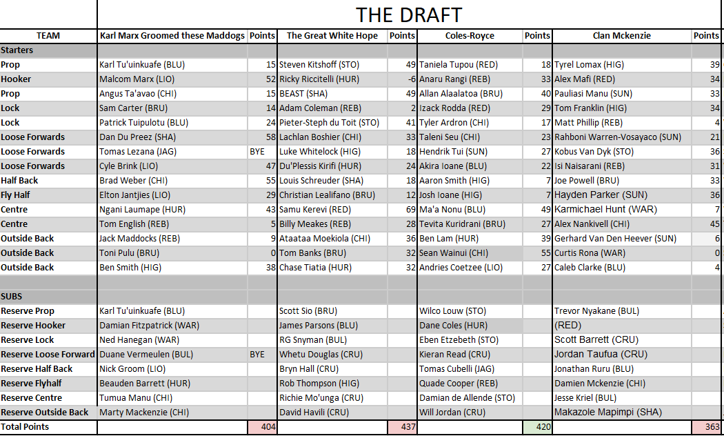 Nsync’s finals aspirations still live as his 12 man team stole a narrow bonus point win over now second place Blake. The loss has him 12 points behind fourth place, with an attacking BP coming off the back of newly drafted Semisi Masirewa (79 points) who somehow did it again, Rory Arnold (74) who was as good in real footy as he was in fantasy footy, Bryce Hegarty (52), Kerron van Vuuren (49) and Will Genia (47). Meanwhile Blake’s 15 man side squeezed out a bonus point loss, boosting him up to 2nd place on the back off Samu Kerevi (69 points) as he again carried the Reds attack, Beast and Kitshoff (49) and Pieter-Stephdu Toit (41). Blake once again shows he is the master of playing the man, but the matchup still reads Nsync 2 – Blake 0.