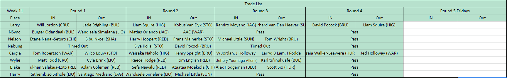 This week the Trade night order and picks were: