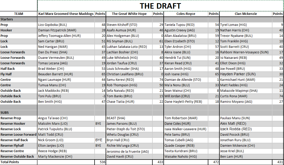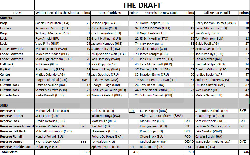 The hot run of form continues for Nelson as his Otere is the new Black posted the biggest score of the week against the limp showing from Nsync’s White Linen Hides the Sinning. Nelson drafted in Luke Jacobson (87 points) from Harry this week, giving up McCaffrey and Guido Petti to make it happen. It looks to be a stroke of genius, as the former NZ U20’s captain single-handedly tore the Highlanders team apart. Anton Lienert-Brown (61) is another freakishly talented man on the roster, as is the fantasy form of Tate McDermott (57) who seems to be getting more minutes each week as he cements himself as the first choice Reds scrum half. Solid outings for James Lentjies (52) and Liam Coltman (49) rounded the week off as Nelson makes a timely play at the top 4. Just as Nelson has traded wisely week in week out, Nsync has missed huge opportunities. This week his first round trade of Burger Odendaal, who was appropriately a free agent, backfired when he was ruled out late with an eye injury. Did we mention that Nsync was the desperate manager that picked up Semisi Masirewa (-23 points!!!) a few weeks ago? This is what we all feared could happen from the Sunwolves top try scorer, and he didn’t disappoint. The question now is does Nsync persevere with such a lame duck in the hope of seeing the form that shocked the fantasy world for the first half of the season, or does he cut his losses? On the other hand picking Bryce Hegarty (79 points) over Handre Pollard (19) was a master stroke, if only he’d done the same in the outside backs and started Dillyn Leyds (43) instead of the aforementioned battler. Scores from Vaea Fifita (54) and Matias Orlando (49) rounded this game out as Nelson (5th) took control of the head to head 2-0, and brought himself solidly back into finals contention, only 4 points behind second place.