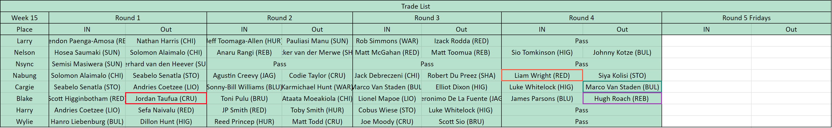 This week the Trade night order and picks were: