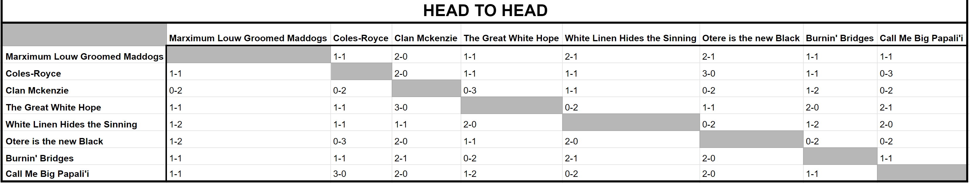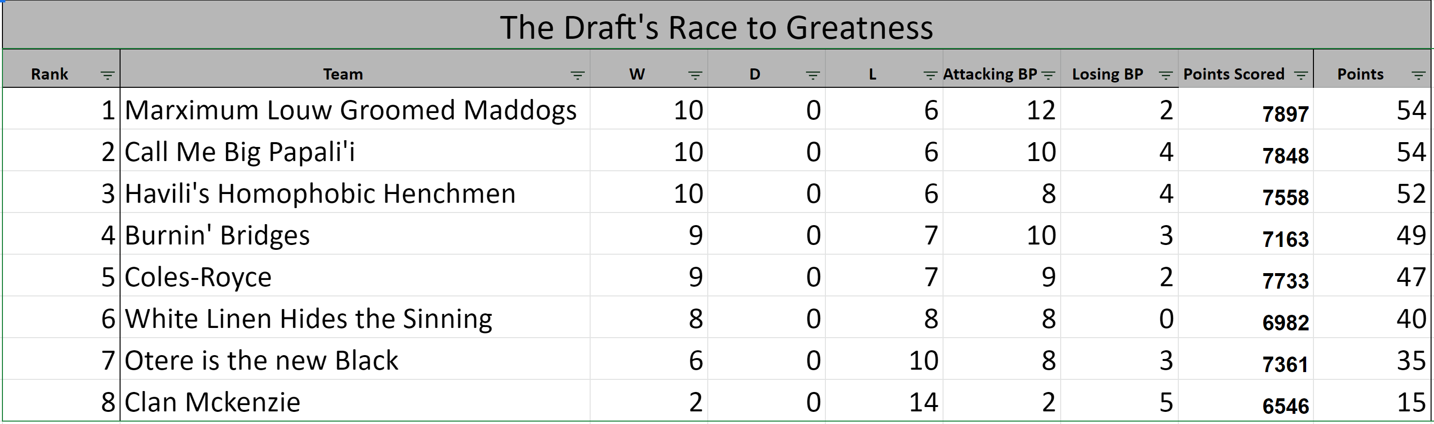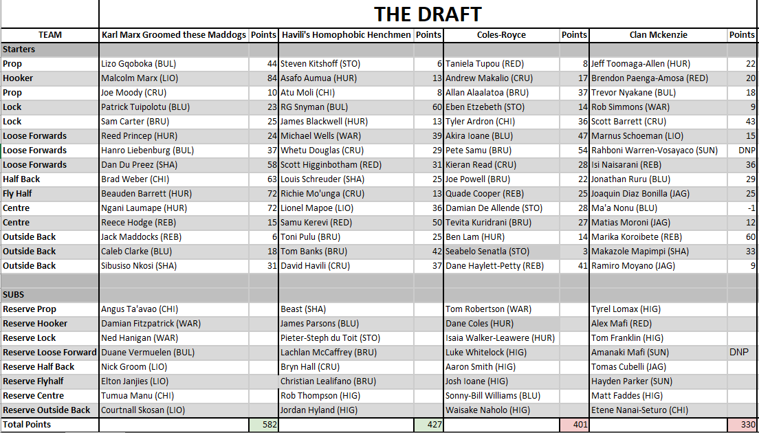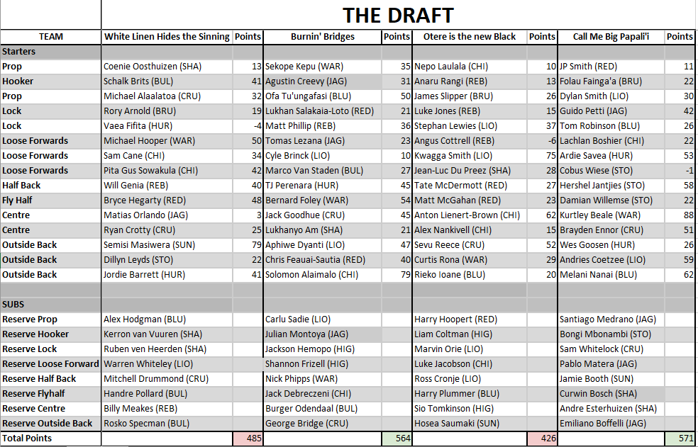 This one was tied up at 1 a piece before the pivotal final match-up. Nelson needed the win to have any hope of playing finals, while Wylie sits narrowly on top of a 5 man battle royal for the post season. Wylie answered the challenge with aplomb by taking out the biggest score of the week yet again. Malcolm Marx (84 points) top scored for the Maddogs, while Beauden Barrett and Ngani Laumape (72) both killed it. Throw in Brad Weber (63), Dan du Preez (58) and Lizo Gqoboka (44) and we start to see how he scored so well. Meanwhile Nelson feels aggrieved because he has now faced the top scoring manager 6 rounds from a possible 16. The thing he is forgetting, is that the goal of fantasy football is to actually score the highest yourself! Needless to say Otere is the New Black’s 426 was far from that. Kwagga Smith (75 points) didn’t let last years loser down, nor did Anton Lienert-Brown (62) and Sevu Reece (52). Nelson’s biggest problem has now firmly become Rieko Ioane (20). The under performing winger’s form doesn’t warrant selection, but standing him down would take some serious kahunas. The head to head finishes at Wylie 2, Nelson 1.