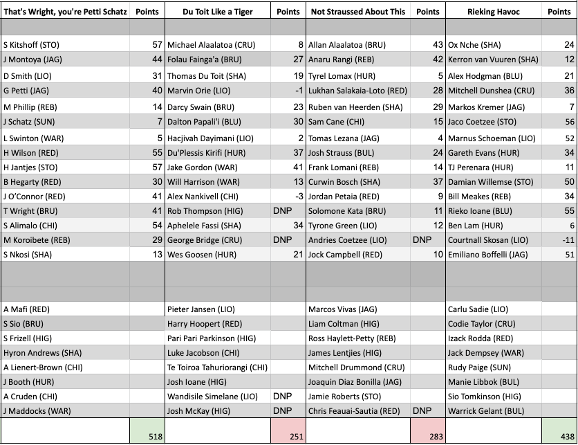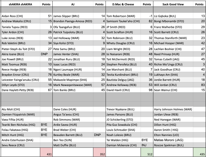Both team’s lived up to their names this week, Rieko Ioane certainly wreaked havoc with some of that electric form we know he is capable of; 2 tries and 55 pts, whilst like his team name, AJ’s team performance is TBA (the rookie AJ not knowing about the curse of not naming your team pre kick off). Like Rieko, many of nabungs men started the season with absolute flyers, he had a solid foundation with 5 players scoring in the 50s: Jaco Coetzee (56 pts), Rieko Ioane (55), Marnus Schoeman (52), Boffelli (51) & Damian Willemse (50). He was however sorely let down by Courtnall Skosan with – 11 pts (missing 5 of 8 tackles) and also both managers were affected by the ‘Horrocanes’ with both Ben Lam (6pts for nabung) or Ngani Laumape (14 pts – AJ’s first pick) barely touching the pill in round one. Now both teams suffered a few injuries this week but AJ was very unlucky to lose both BPA and Siya Kolisi very early into their fixtures and that really hurt him in the context of how well their teams and replacements did.