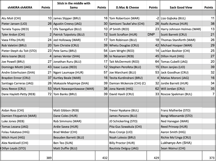 shAKIRA shAKIRA bagged their first win of the 2020 season by only 51 points (1 point more than last years losing bonus point requirement but in 2020 we changed it to losing by under 25 points). Highlights did not include the namesake Akira Ioane making a pretty lacklustre appearance for the last 11 minutes off the bench (4 pts) but rather came by way of DHP realising he’s going to have to do it all himself for the Rebels in 2020 (72 points), Sevu Reece (53 points) back starting and familiarly finding his way over the tryline (twice), pivotal trade night pickup Domingo Miotti (43 points) and Braydon Ennor 37 points. Round 2 disappointments came in the form of Taniela Tupou (1 point) after copping a yellow card and Tyler Ardron (2 points).