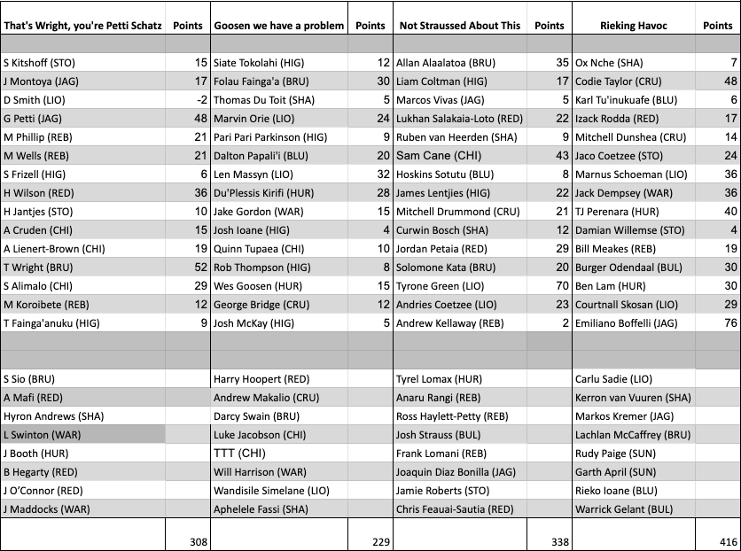 Alright enough heaping on Nels (he just makes it too easy), we should be talking about the new kid on the block and competition leader going in to round 2, Newbung beating Nelson out by the biggest margin of the week, 79 points. The namesakes delivered with Tom Wright top scoring for his team (52 pts) and like Newbung one to watch in 2020 and also Guido Petti delivering a rock solid performance with 48 pts. Apart from that it was pretty average across the park, alot of big names less with less than appealing scores. Particularly disappointing and to make Nelson feel a little better, Newbungs’ highlanders Shannon Frizell only managed a 6 point cameo off the bench and trade night pickup Tima Fainga’anuku proved a fantasy flop with 9 pts.