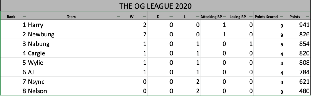 Two weeks in and our second rookie top scores the OG League with AJ’s Stuck in the middle with Samu getting the closest to an attacking bonus point (18 points off) and defeating Wylie’s Sack Good View by 59 points. AJ had the all round most consistent scoring throughout his team and whilst it wasn’t his teams top score, namesake Pete Samu (54 pts) certainly lead the charge. His top scorer was a man who is not unaccustomed to leading the charge, none other than his first draft pick Ngani Laumape (57 pts). We usually don’t blink unless a score is over 40 but in a low scoring fantasy week, AJ had 6 players all in the 30’s including his outside backs of Mapimpi & Banks with 39 pts and Nawaqanitawase (38 pts). The others were exciting young backrowers, trade night pickup Tom Christie (39 pts) & James Venter (36 pts). Gus Creevy 30pts off the bench was master pickup after losing Brandon Paenga-Amosa to injury last week.