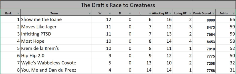 Round 18 Final scores: You, Me and Dan du Preez 531 Defeats 512 Wylie's WabbeleysHip Hip 2.0 437 Defeats 396 Show me the Ioane Moves Like Jager 611 Defeats 421 Inficiting PTSDMost Hope 610 Defeats 533 Krem de la Krem How it Happened! Once again I can't do a full round review so i'll stick to … Continue reading 2018 OG Draft Rd 18 The Final Round