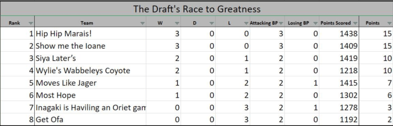 Round 18 Final scores: You, Me and Dan du Preez 531 Defeats 512 Wylie's WabbeleysHip Hip 2.0 437 Defeats 396 Show me the Ioane Moves Like Jager 611 Defeats 421 Inficiting PTSDMost Hope 610 Defeats 533 Krem de la Krem How it Happened! Once again I can't do a full round review so i'll stick to … Continue reading 2018 OG Draft Rd 18 The Final Round