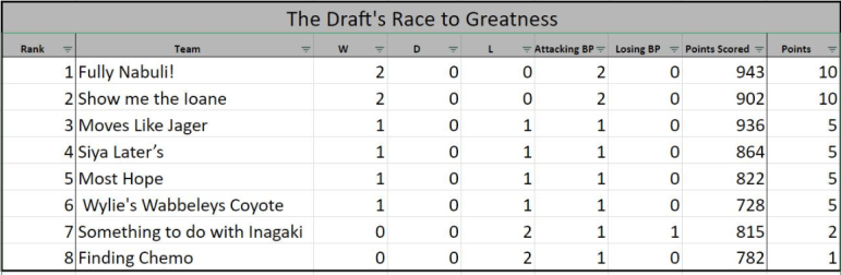 Round 3 Results: Show me the Ioane 402 defeats 368 Finding Chemo Wylie's Wabbeleys 436 defeats 393 Moves Like JagerMost Hope 445 defeats 328 Something to do with InagakiFully Nabuli! 435 Defeated 399 Siya Later How it happened! Round 2 saw some upsets alright, with all members of the Dale family recording losses. How good! Show … Continue reading 2018 OG Draft Rd 3 Results